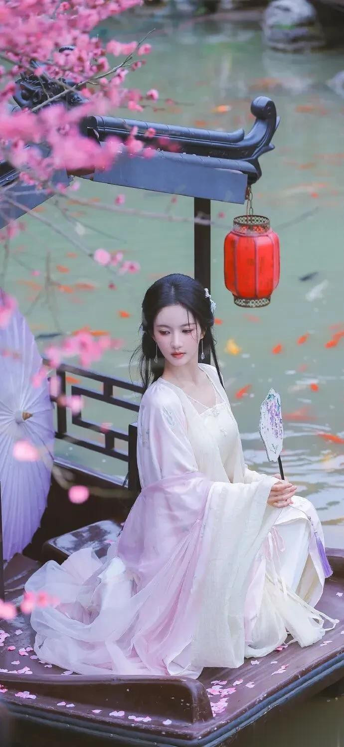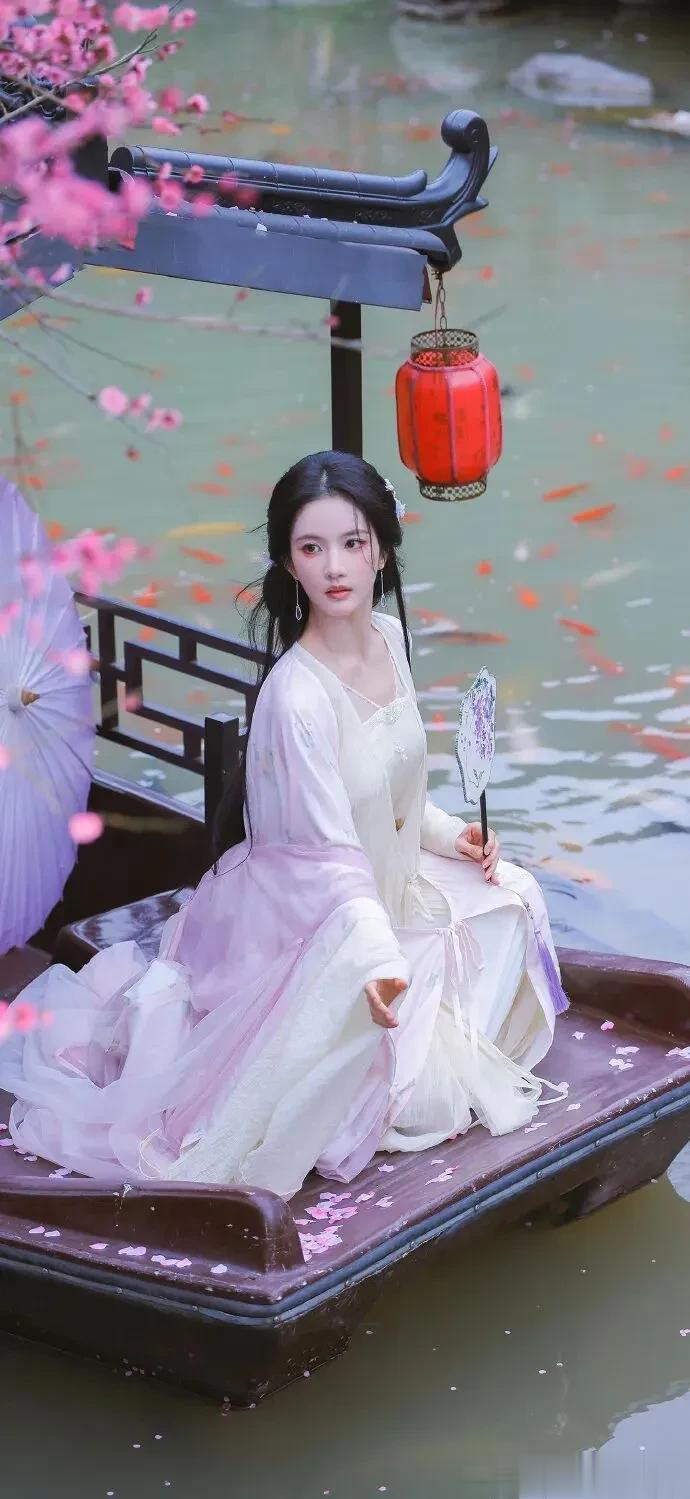 看她在小船上的那张,淡粉的衣袂轻轻拂过船板,水里的锦鲤围过来,好像连它们都忘了游动。她手里那把团扇半遮面,眼神温婉得能掐出水来。
