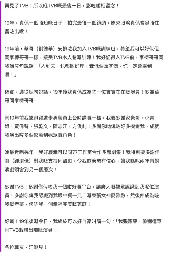 张頴康发文说:再见了TVB,所以在TVB的最后一天,拍了些照片留念,19年,真是一个不短暂的日子!拍完最后一个镜头,原来眼泪真是会忍不住流了出来!