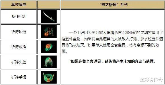 祈祷手镯和祈祷戒指,祈祷项链,祈祷头盔以及祈祷之刃可搭配成特殊套装,只要能集齐这五件套并且佩戴起来,玩家就能触发所在服务器的所有7级以下的宝宝发生叛变,在祈祷套装生效的时间里,不断召唤宝宝也会不断发生叛变。当年经历过这种大事件的玩家都是资深老司机了,确实比较幸运。